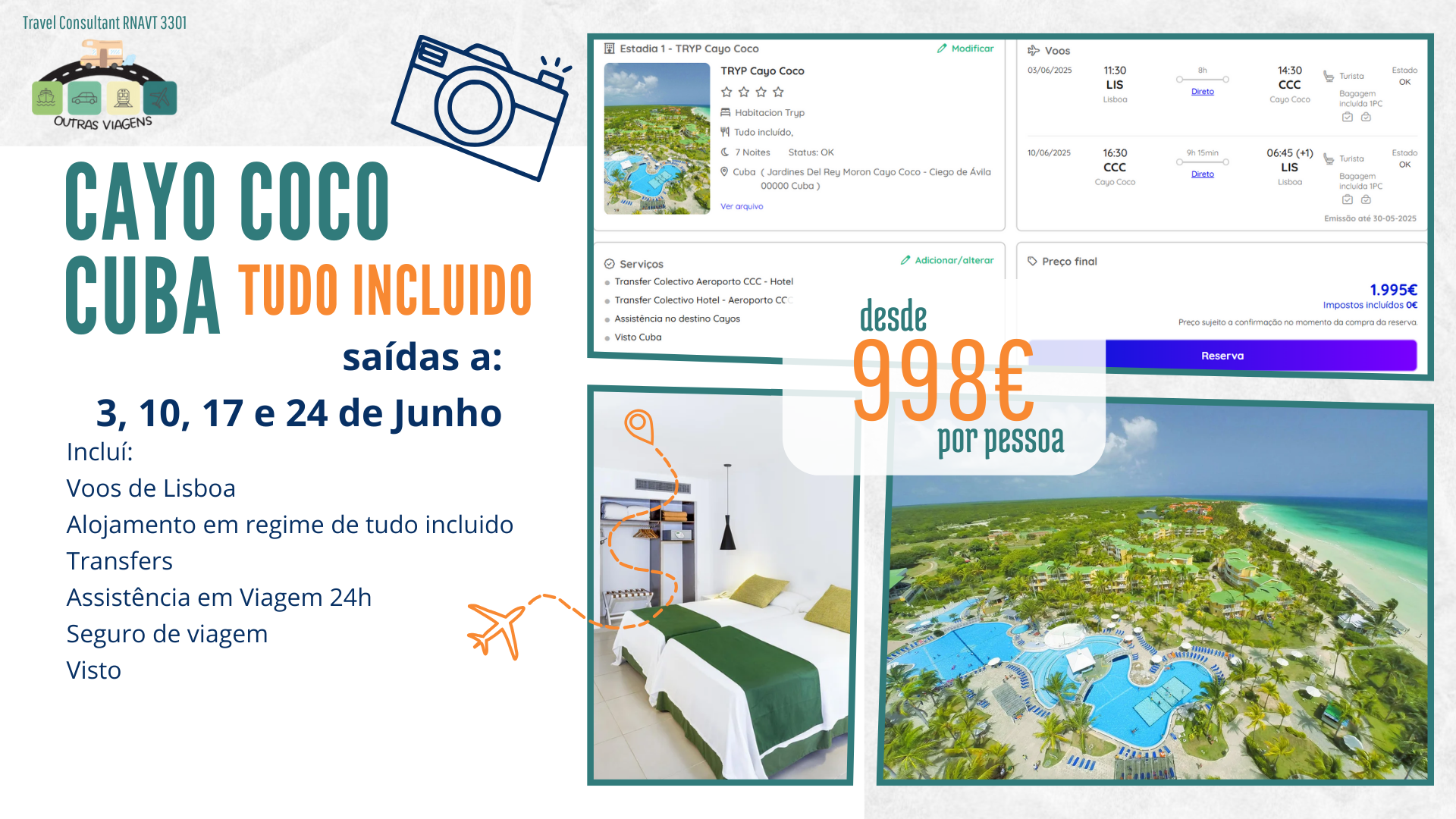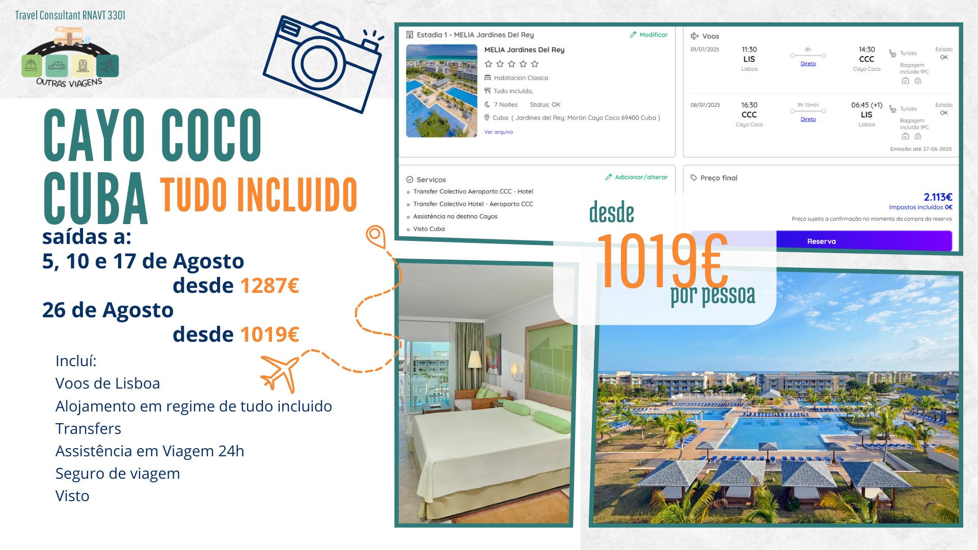 As simulações foram feitas para 2 adultos em quarto duplo e estão dependentes da disponibilidade do operador turistico.