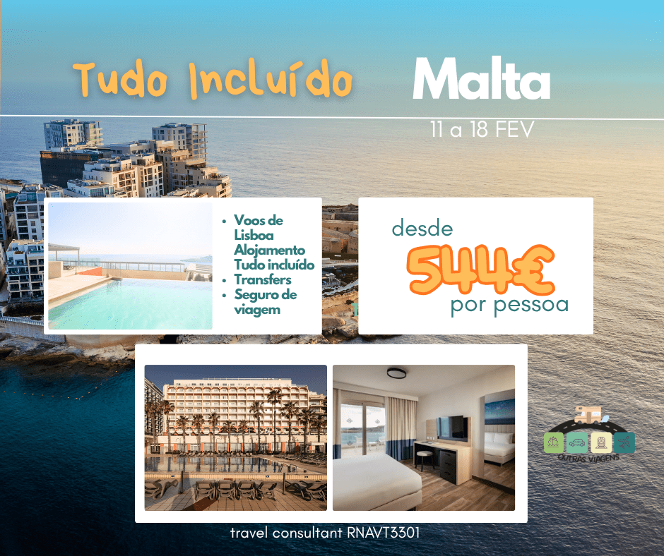 Em fevereiro, trocamos o frio por sol e mar em Malta. Com voos diretos de Lisboa, e estadia de 7 noites em hotel de 4*onde oferece conforto, boa comida, piscina aquecida e vista incrível. E o melhor: vamos celebrar o Dia dos Namorados (14/02) num destino romântico e diferente, com clima ameno e paisagens de sonho. Apenas 544 € por pessoa para uma semana completa no Mediterrâneo — impossível resistir a esta escapadinha perfeita!